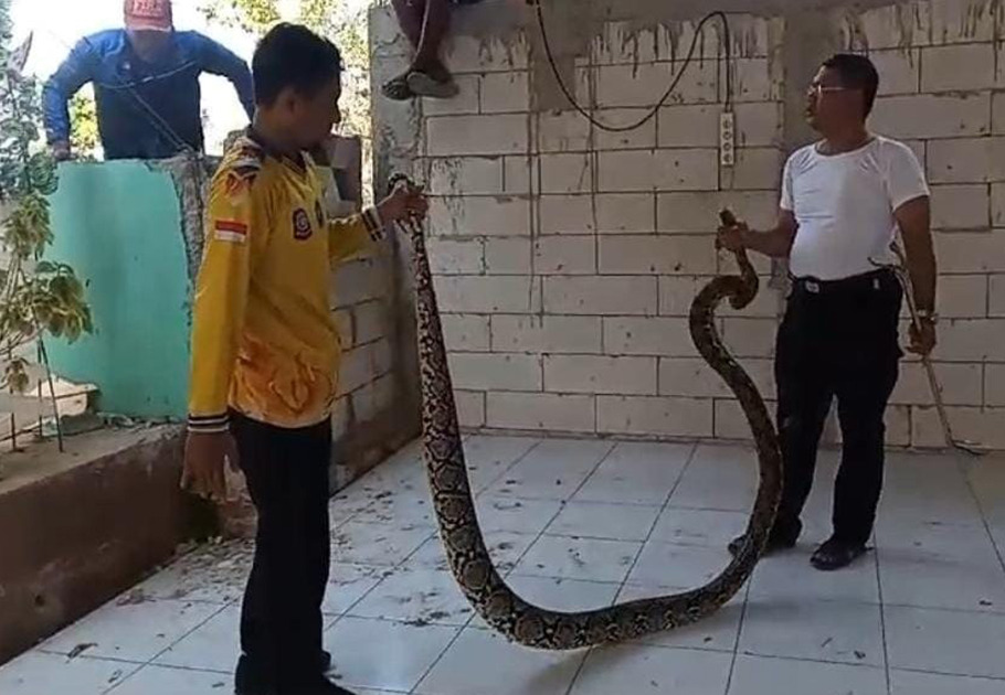Seekor ular piton dengan panjang sekitar 4 meter yang muncul di kawasan wisata kampung air Desa Sambonggede, Tuban, akhirnya ditangkap. Selasa (3/10/2023).