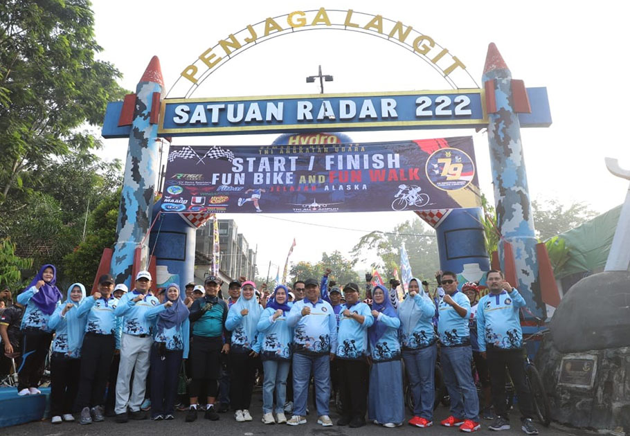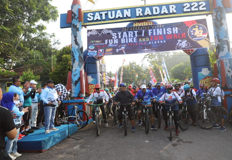 JOMBANG, beritadesa.com-Bupati Jombang, Warsubi, menunjukkan dukungan penuh terhadap peringatan Hari Ulang Tahun (HUT) ke-79 TNI Angkatan Udara (AU) dengan hadir dan memberangkatkan peserta  fun bike & fun walk jelajah Alaska (Alas Kabuh) dan panggung hiburan yang diselenggarakan di Satuan Radar 222 Ploso, yang ada di Kabuh pada Sabtu (3/5/2025) pagi.