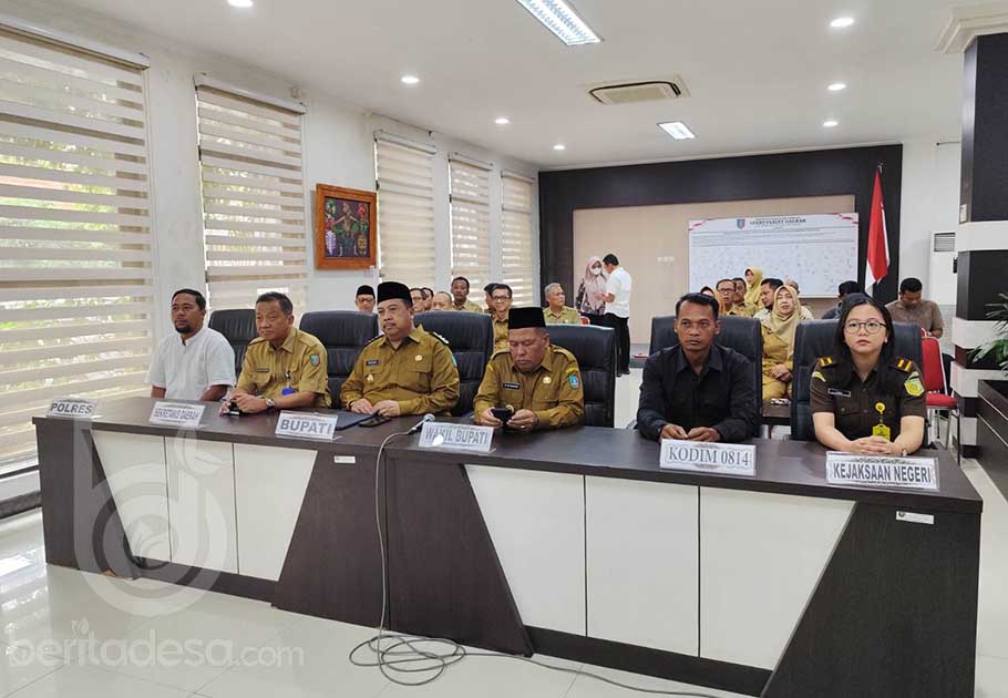 JOMBANG, beritadesa.com-Bupati Jombang H Warsubi, dan Wakil Bupati Jombang M. Salmanudin bersama kepala OPD terkait beserta Tim Pengendalian Inflasi Daerah (TPID) Kabupaten Jombang, mengikuti Rapat Koordinasi (Rakor) Pengendalian Inflasi dan Akselerasi Sertifikasi Produk Halal, bersama Kementeri Dalam Negeri (Kemendagri) Republik Indonesia, melalui zoom meeting diruang Media Center Kantor Sekretariat Daerah Kabupaten Jombang. Pada Selasa (4/3/2025).