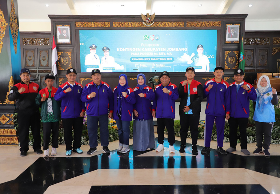 JOMBANG, beritadesa.com-Bupati Jombang, Warsubi, didampingi Wakil Bupati Jombang, Salmanuddin, resmi melepas kontingen PORSENI Madrasah Kabupaten Jombang yang akan berlaga di tingkat Provinsi Jawa Timur tahun 2025. Acara pelepasan berlangsung khidmat dan semarak di Pendopo Kabupaten Jombang pada hari Rabu, (2/7/2025) pagi.