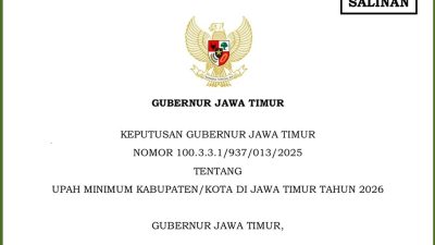 SURABAYA, beritadesa.com-Pemerintah Provinsi Jawa Timur secara resmi telah menetapkan daftar Upah Minimum Kabupaten / Kota (UMK) tahun 2026, melalui Surat Keputusan Gubernur Jawa Timur Nomor : 100.3.3.1/937/013/2025 tentang UMK di Jawa Timur Tahun 2026 yang ditetapkan pada 24 Desember 2025.
