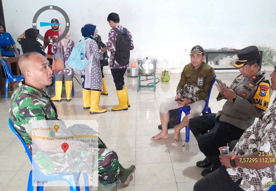 JOMBANG, beritadesa.com-Forum Komunikasi Pimpinan Kecamatan (Forkopincam) Mojoagung, Kabupaten Jombang, yakni Camat, Danramil, Kapolsek Kecamatan Mojoagung serta babinsa, anggota polsek setempat dan juga di dampingi oleh Perangkat Desa Kademangan. Melakukan Pemantauan Banjir ke Desa Kademangan Kecamatan Mojoagung, Jombang Kamis (23/1/2025). Banjir tersebut, akibat hujan yang turun dari sore hingga malam hari mengakibatkan Desa Kademangan Kecamatan Mojoagung Jombang, mengalami Banjir hingga kurang lebih 1 meter dan masuk rumah warga.