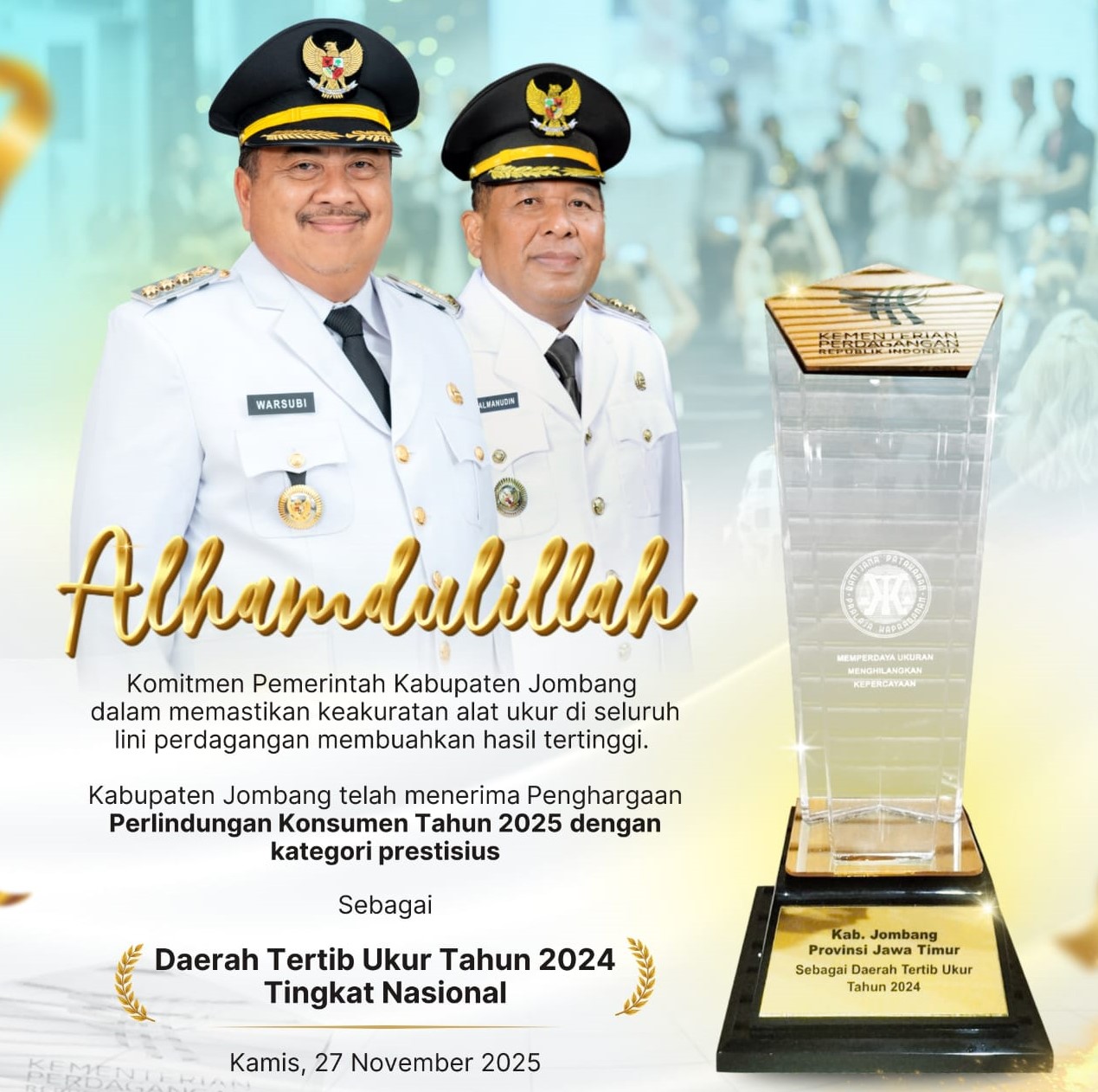 Penghargaan Perlindungan Konsumen Tahun 2025 dengan kategori prestisius, Sebagai Daerah Tertib Ukur Tahun 2024 Tingkat Nasional.