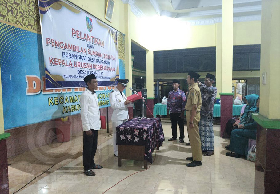 JOMBANG, beritadesa.com-Pemerintah Desa (Pemdes) Karanglo, Kecamatan Mojowarno, Kabupaten Jombang Jawa Timur, resmi melaksanakan pelantikan dan pengambilan sumpah jabatan perangkat desa baru, untuk posisi Kepala Urusan (Kaur) Perencanaan. Di pendopo balai desa setempat, pada Kamis (20/11/2025) malam.