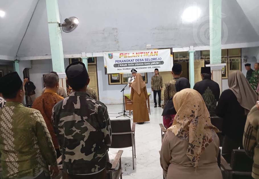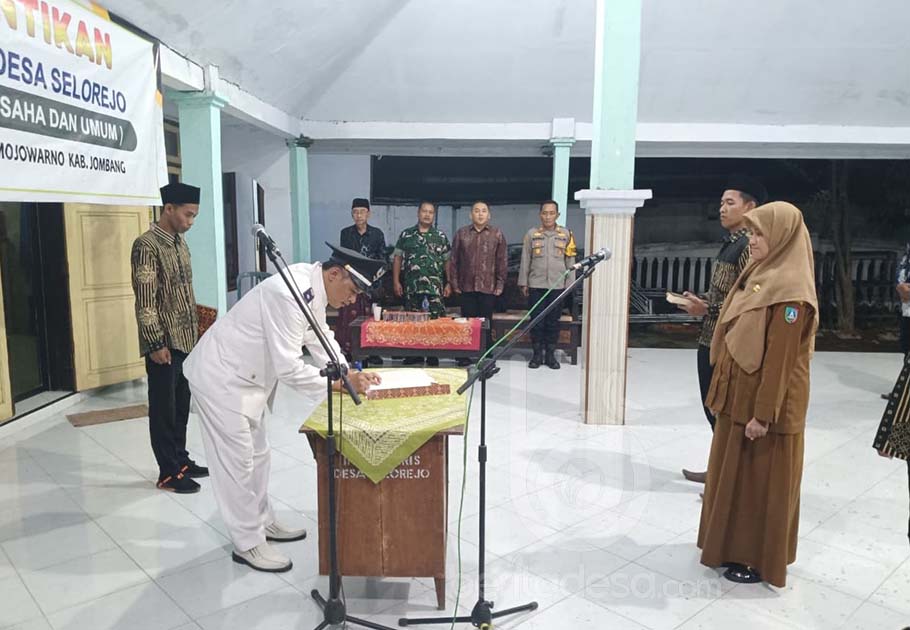 JOMBANG, beritadesa.com-Kepala Desa (Kades) Selorejo, Kecamatan Mojowarno, Kabupaten Jombang, Janji Ainur Rofiq, resmi melantik dan mengambil sumpah Ariena Rochmatin, S.Pd sebagai Kepala Urusan Kaur Tata Usaha dan Umum (Kaur TU dan Umum), dalam acara khidmat yang digelar di Pendopo balai setempat, pada Jumat (21/11/2025) malam.