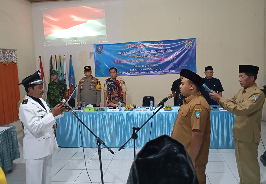 JOMBANG, beritadesa.com-Kepala Desa (Kades) Tanjunggunung, Kecamatan Peterongan, Kabupaten Jombang Samsuri, resmi melantik dan mengambil sumpah satu orang perangkat desa yang baru.