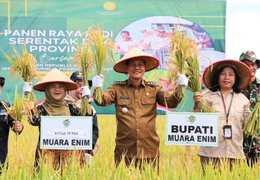 MUARA ENIM, beritadesa.com-Bupati Muara Enim, Edison, didampingi Ketua tim pengerak PKK Kab. Muara Enim, Heni Pertiwi Edison melakukan kegiatan Panen Raya Nasional bersama Gabungan kelompok tani (Gapoktan) Desa Tanjung, dilahan seluas 130 hektare, di Desa Tanjung Jati, Kecamatan/ Kabupate Muara Enim, pada Senin (07/04/2024).