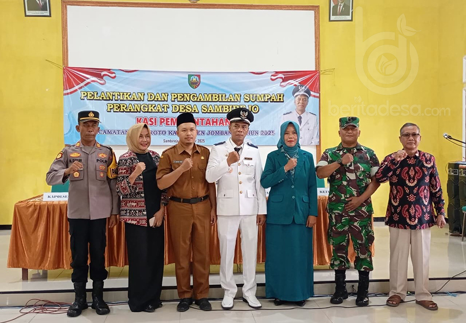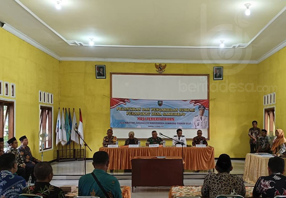JOMBANG, beritadesa.com-Pemerintah Desa Sambirejo, Kecamatan Jogoroto, Kabupaten Jombang, Jawa timur, melaksanakan kegiatan pelantikan dan pengambilan sumpah jabatan terhadap satu perangkat desa baru. Di gedung serba guna kantor desa setempat, pada Jum’at (24/10/2025) siang.