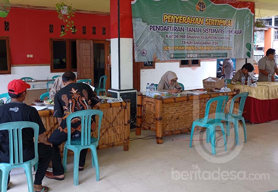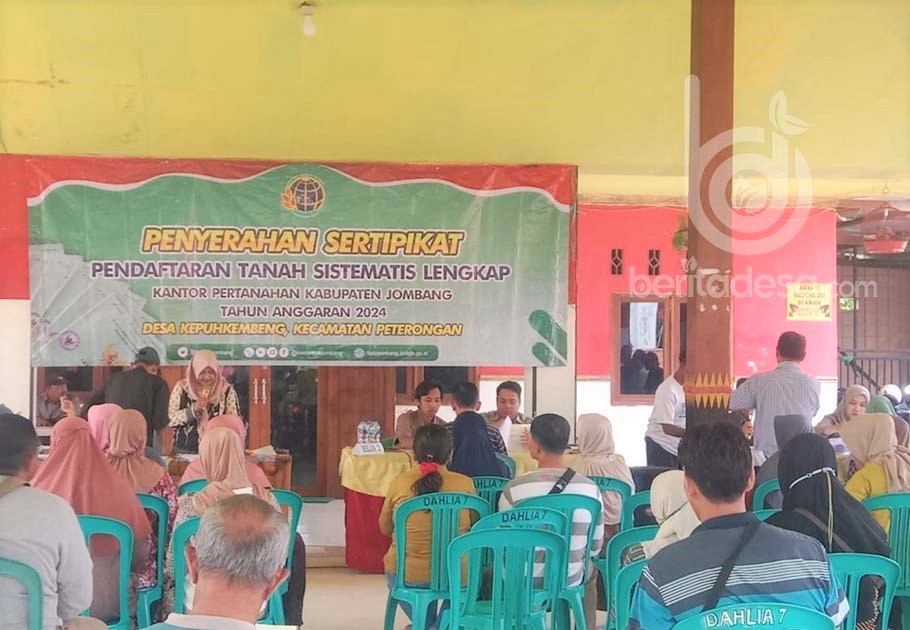 JOMBANG, NusantaraPosOnline.Com-Pemerintah Desa Kepuhkembeng, Kecamatan Peterongan, Kabupaten Jombang, Jawa Timur, terus berupaya memberikan pelayanan terbaik bagi masyarakat melalui program Pendaftaran Tanah Sistematis Lengkap (PTSL). Pada hari ini, 21 Januari 2025. Pemerintah desa tersebut membagikan sebanyak 600 sertifikat tanah kepada masyarakat di Balai Desa setempat.