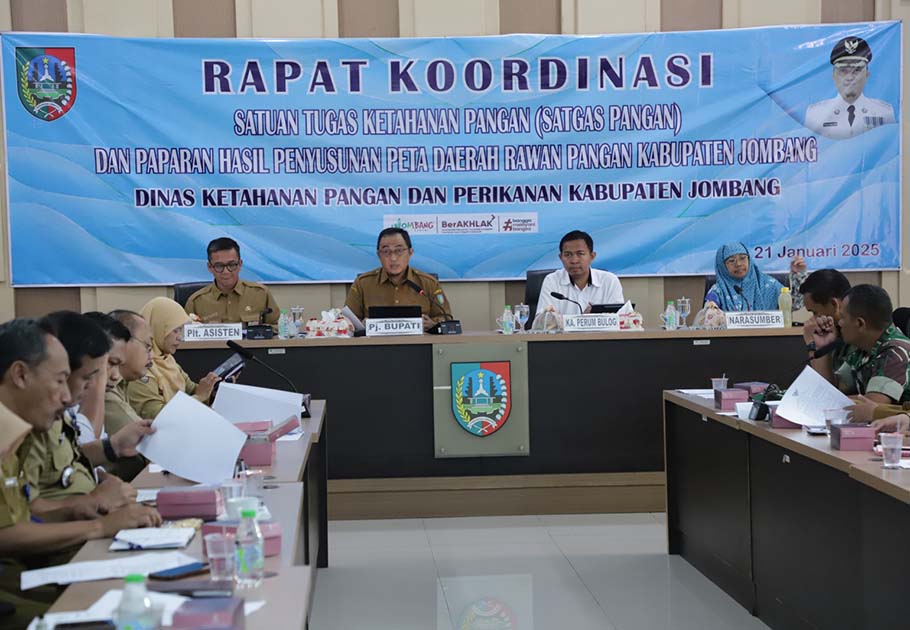 JOMBANG, beritadesa.com-Pemerintah Kabupaten (Pemkab) Jombang menggelar Rapat Koordinasi Satuan Tugas (Satgas) Ketahanan Pangan dan Paparan Hasil Penyusunan Peta Daerah Rawan Pangan, di ruang rapat Swagata, Pendopo Kabupaten Jombang, pada Selasa (21/01/2025) pagi.