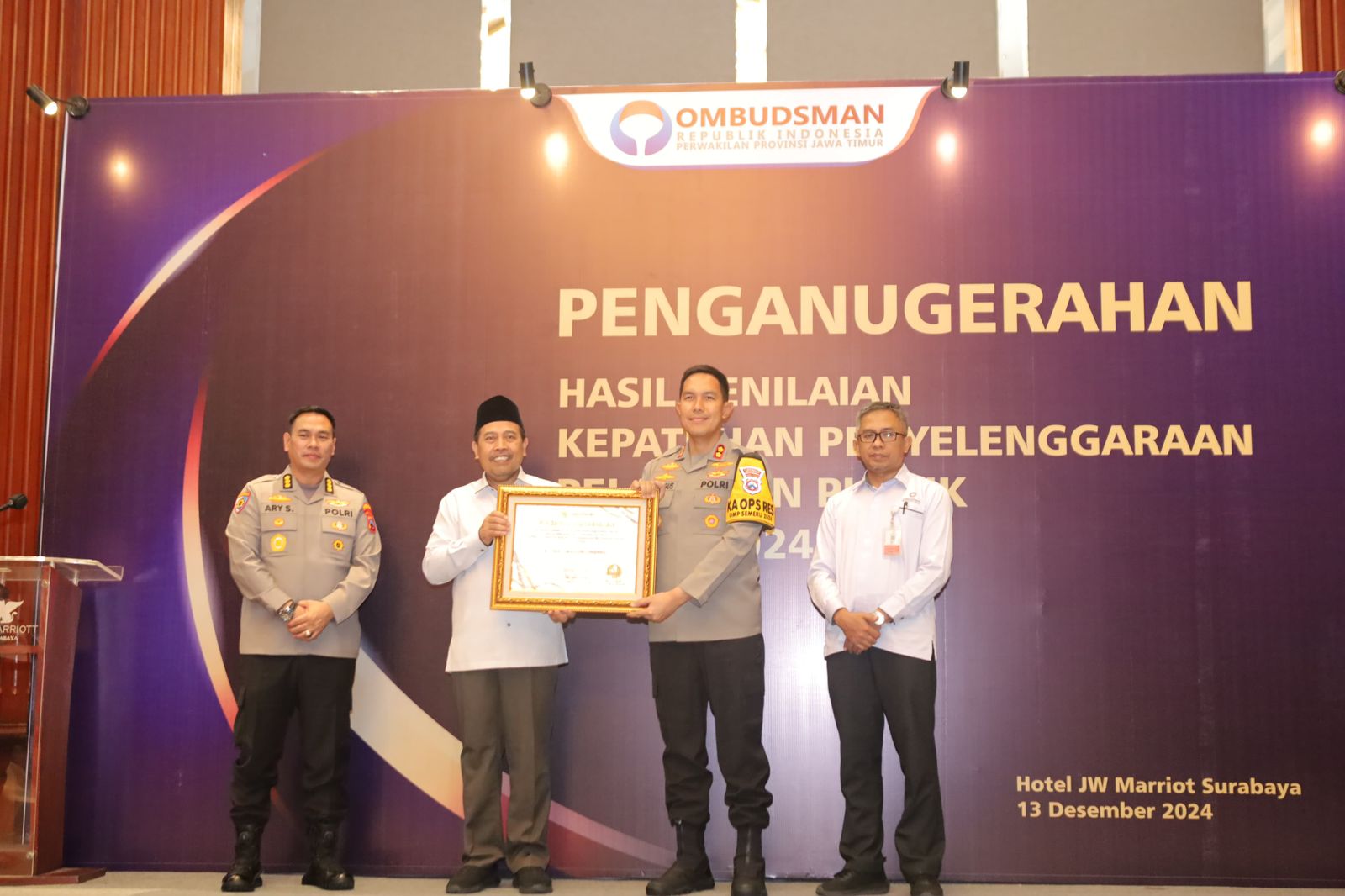 JOMBANG, beritadesa.com – Polres Jombang menerima penghargaan dari Ombudsman Republik Indonesia dalam acara Penganugerahan Predikat Kepatuhan Penyelenggaraan Pelayanan Publik 2024 bertempat di Hotel JW Marriott Surabaya, Jum’at (13/12).