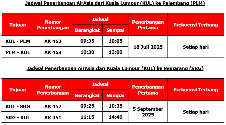 Air Asia akan melayani penerbangan Palembang – Kuala Lumpur setiap hari dengan waktu tempuh sekitar 1,5 jam.