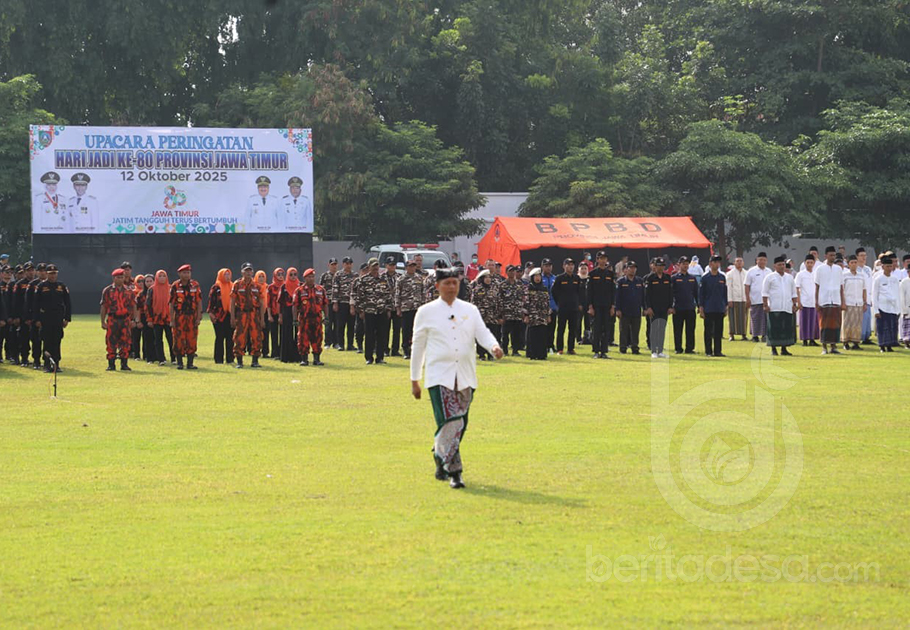 JOMBANGK, beritadesa.com-Pemerintah Kabupaten Jombang menggelar upacara peringatan Hari Jadi ke-115 Pemerintah Kabupaten Jombang, Hari Jadi ke-80 Provinsi Jawa Timur, dan Hari Santri Nasional Tahun 2025. Upacara yang berlangsung khidmat di Lapangan Pemerintah Kabupaten Jombang pada Senin, (21 Oktober 2025) pagi ini dipimpin langsung oleh Bupati Jombang Warsubi yang mengenakan baju Jombang Deles, khas Jombang.
